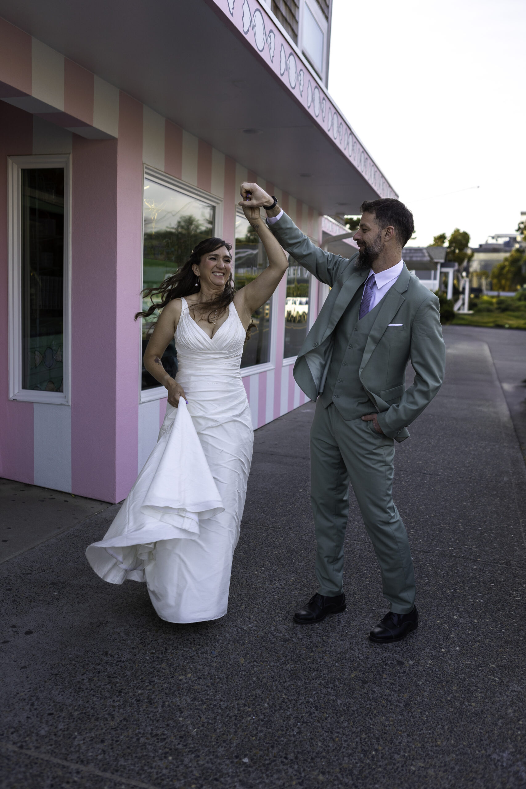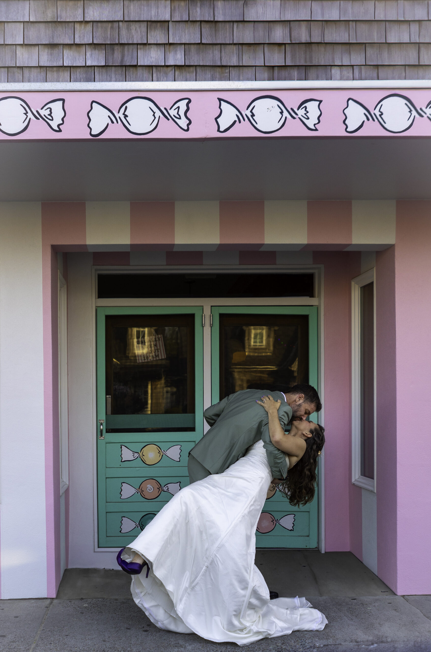 After dinner, they wandered through town in wedding attire like they owned the place (in a good way). They stopped in front of a candy shop that held special meaning for them, snapped a few playful photos, and then headed toward the beach.
