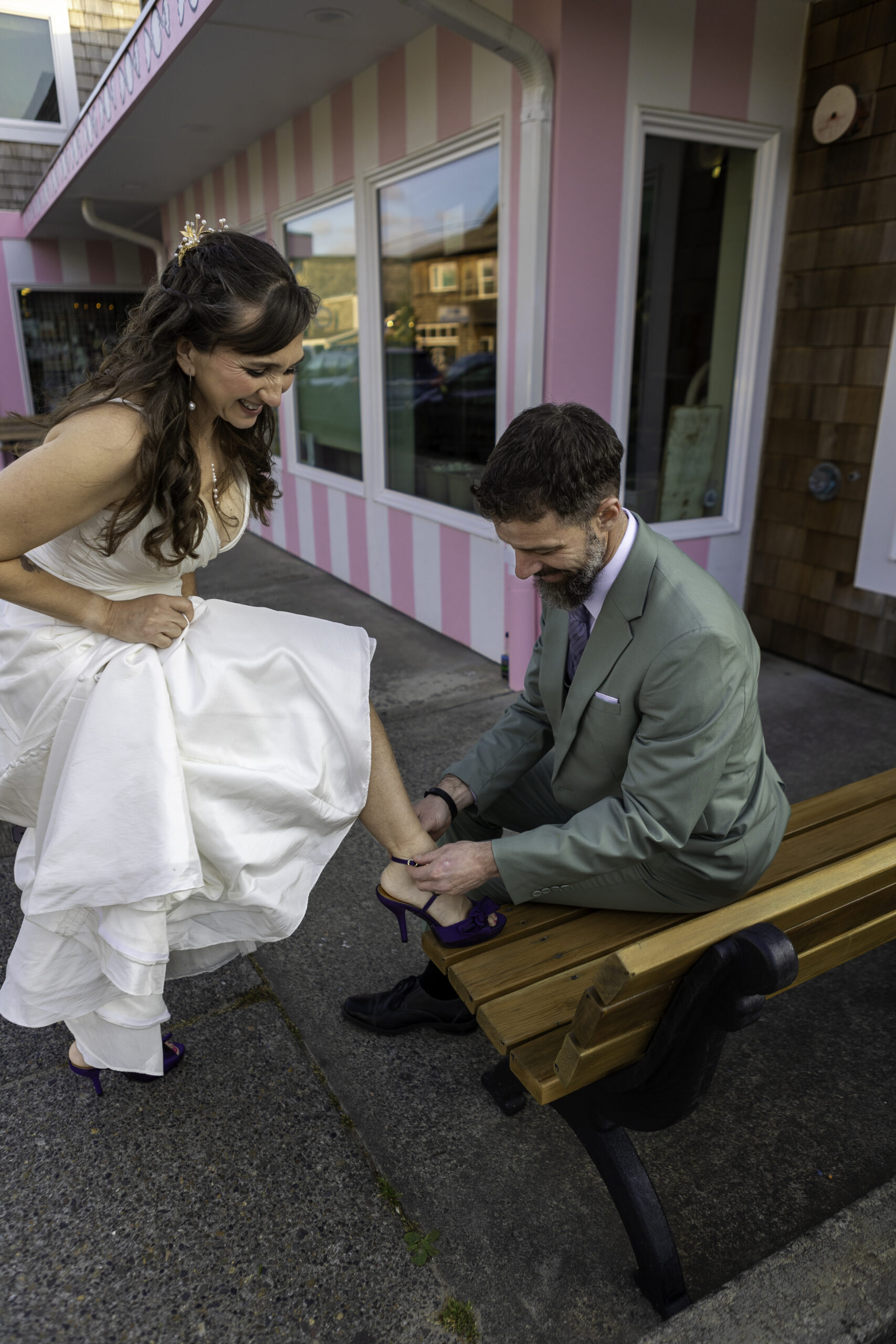 Instead of wondering what to do next, couples are eating, walking, playing, and connecting. These moments naturally create incredible photos and even better memories. Whether it’s sharing drinks at a local brewery, playing games on the beach, walking through town in wedding clothes, or cutting cake by the ocean, these experiences become the story you remember.