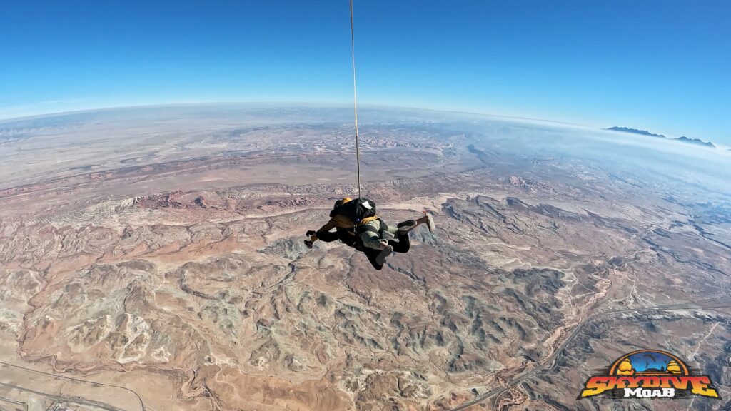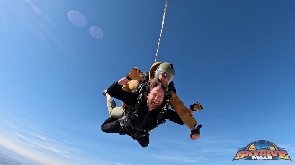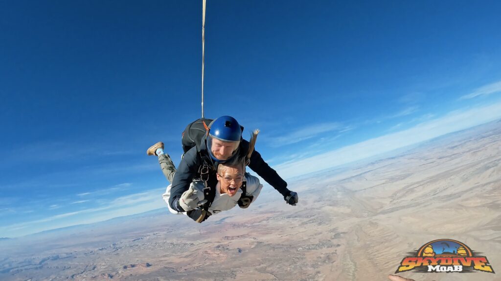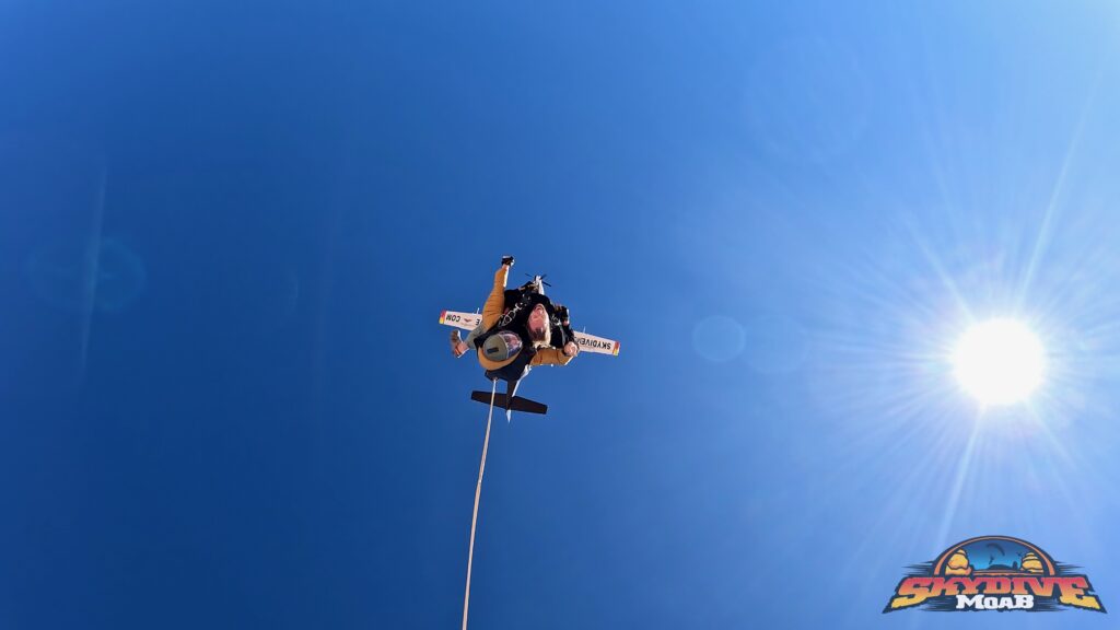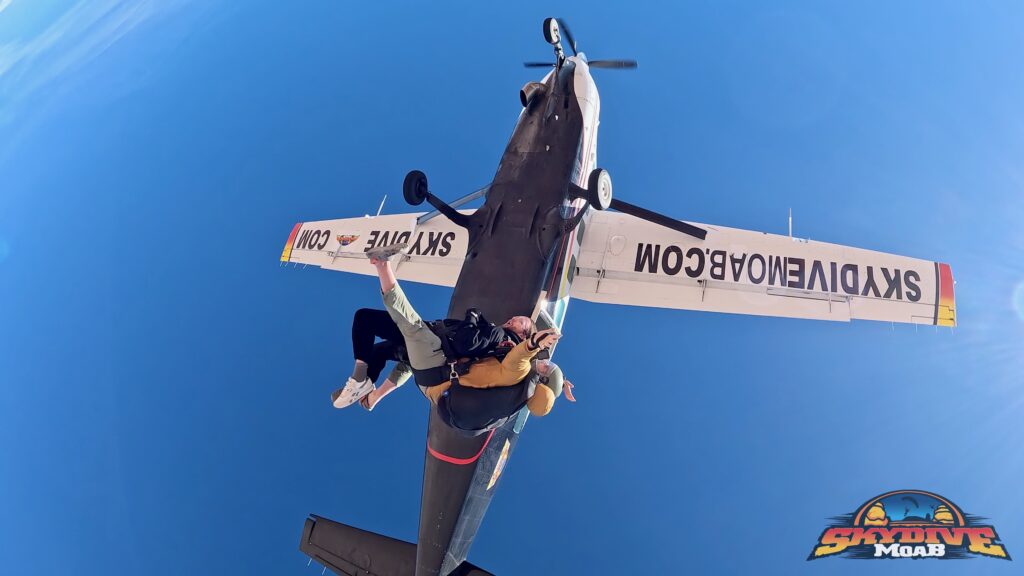 When it was time to go up, they climbed into the small plane and sat packed together on the floor like sardines, single file, one person tucked in front of the next. As the plane lifted off, Moab spread out below them — red rock cliffs, winding roads, and wide-open desert in every direction. When the door finally opened, the wind rushed in and the mood shifted. One by one, they each took their turn, jumping tandem with their instructors from Skydive Moab, cheering each other on from the plane before taking the plunge. And just like that, it was happening.