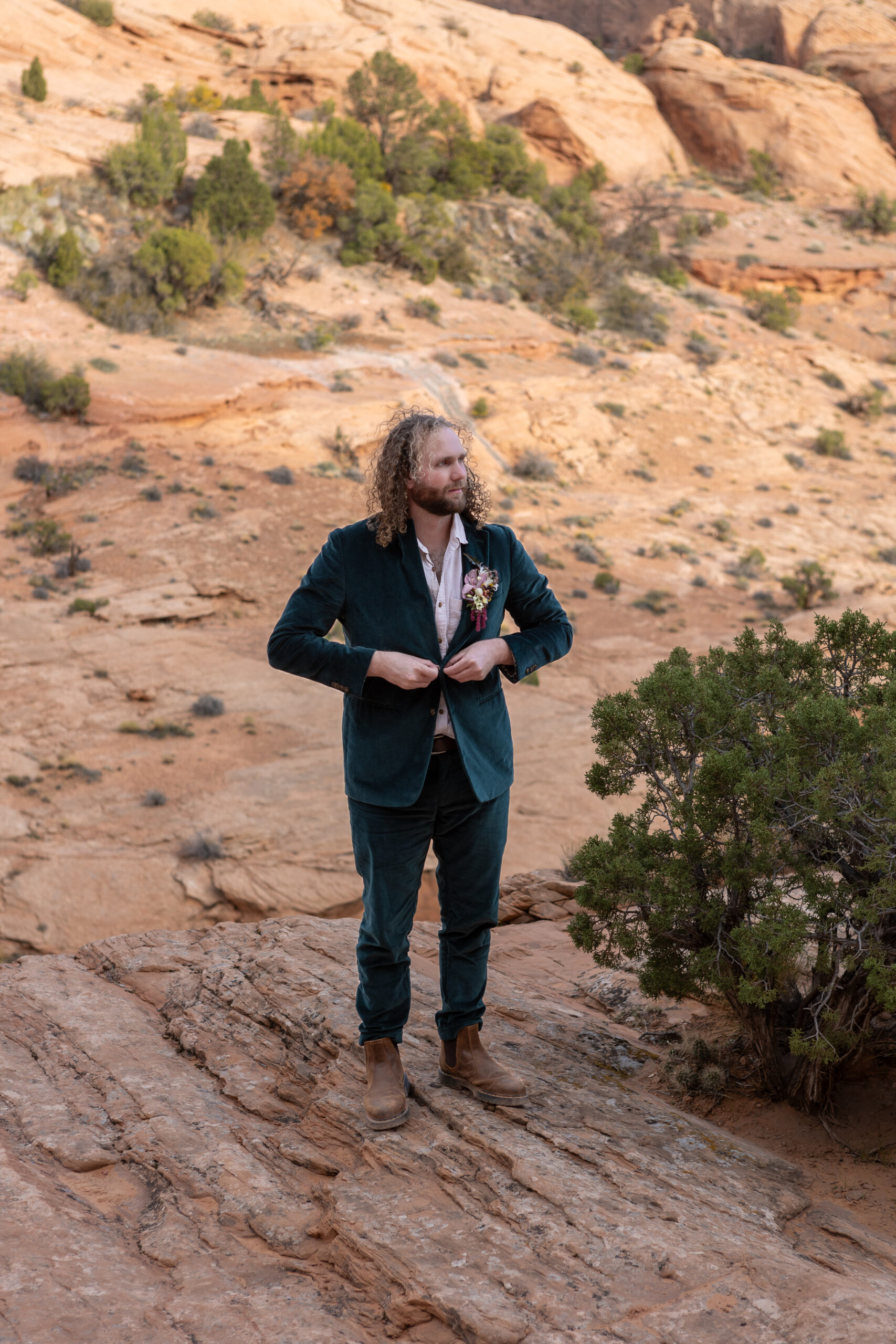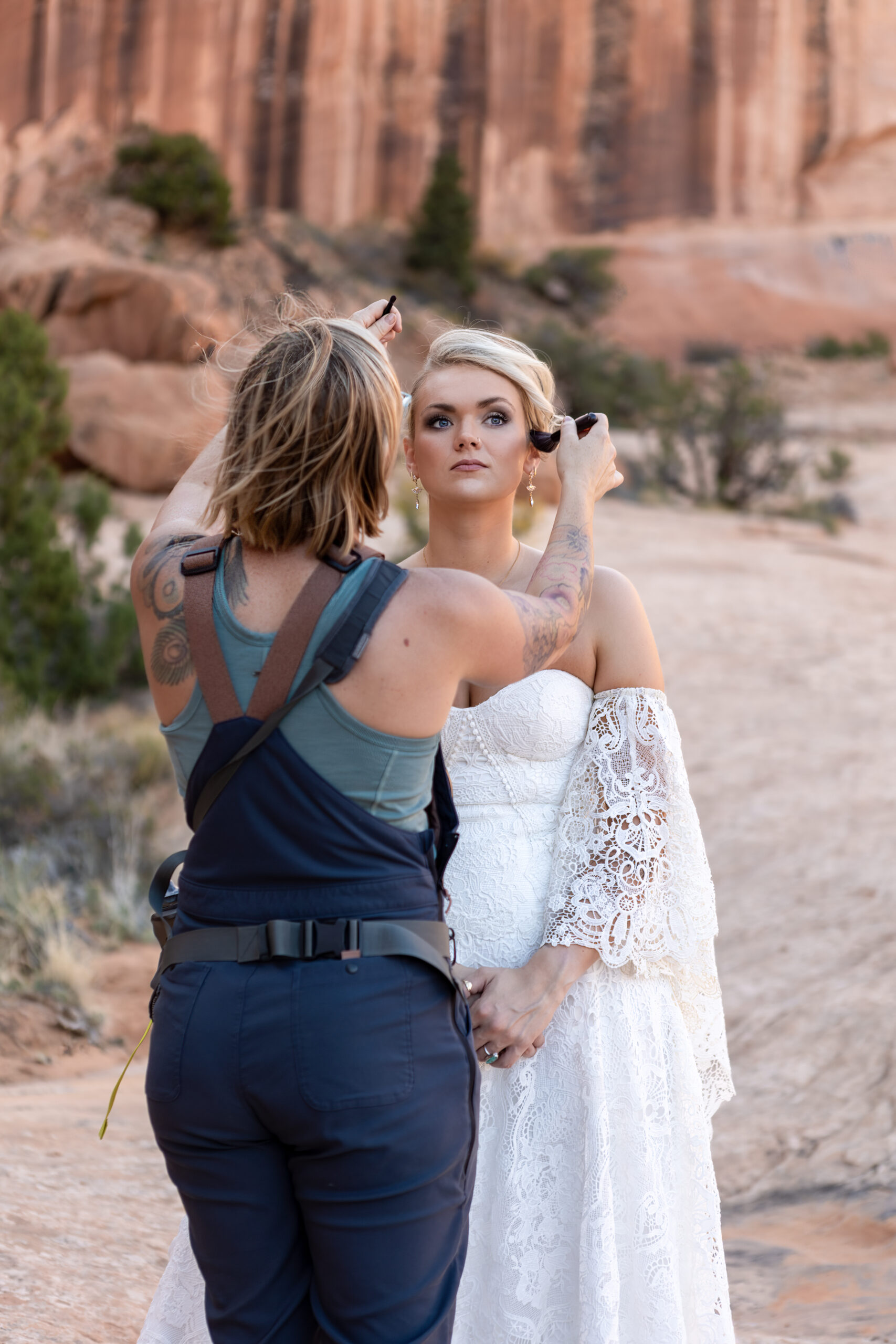 Having Wild Brides Backcountry with us on the hike made a huge difference. They helped keep Isaac cool and camera-ready (anyone who hikes in the desert knows how fast the heat shows up), blotting sweat and reducing redness so he could feel comfortable and confident in photos. Madison was refreshed along the way as well, ensuring she still looked her best after we finished the hardest part of the hike.