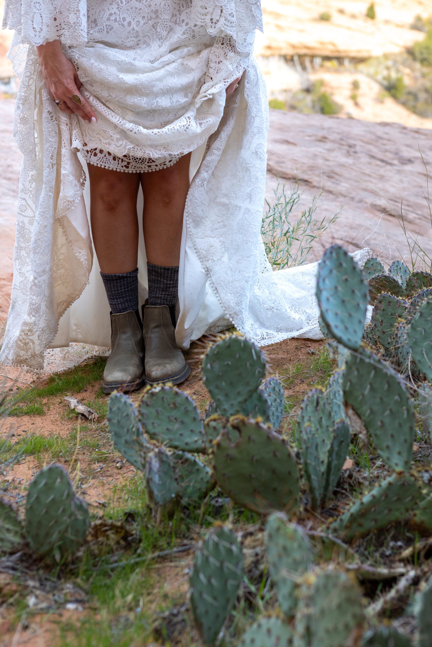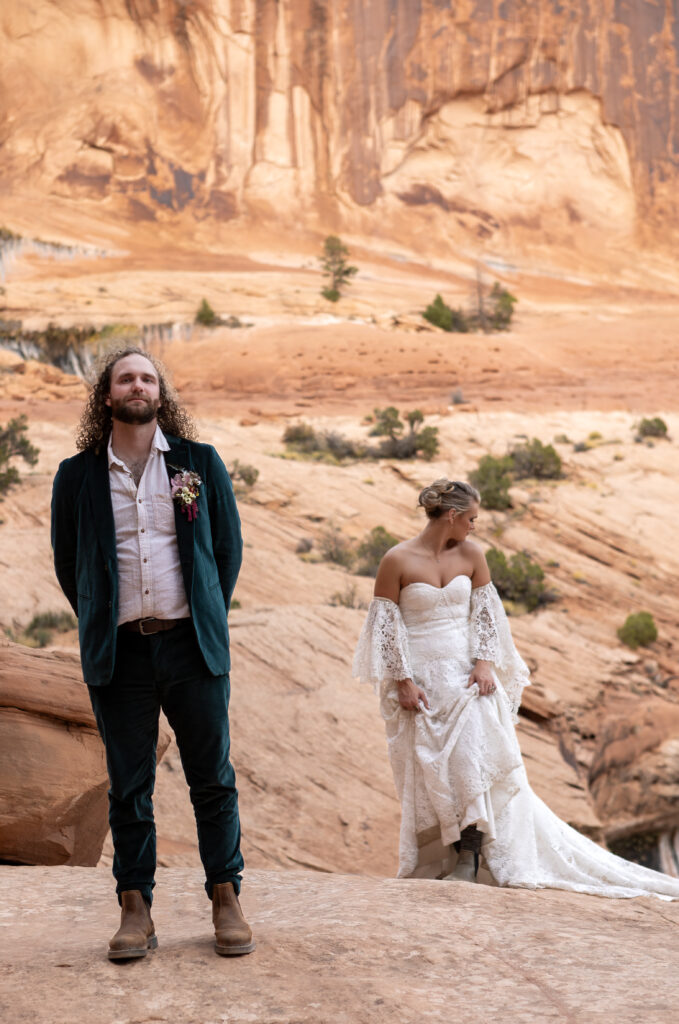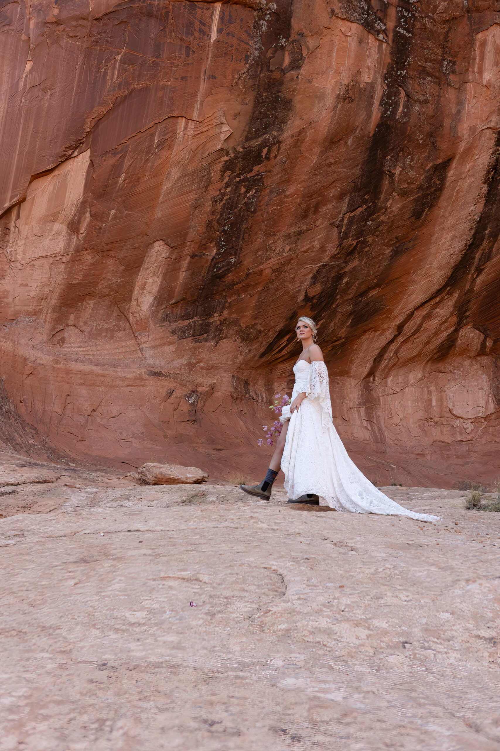 This is exactly why footwear matters on an elopement day, hiking in a wedding dress already adds complexity, and the right shoes make all the difference.