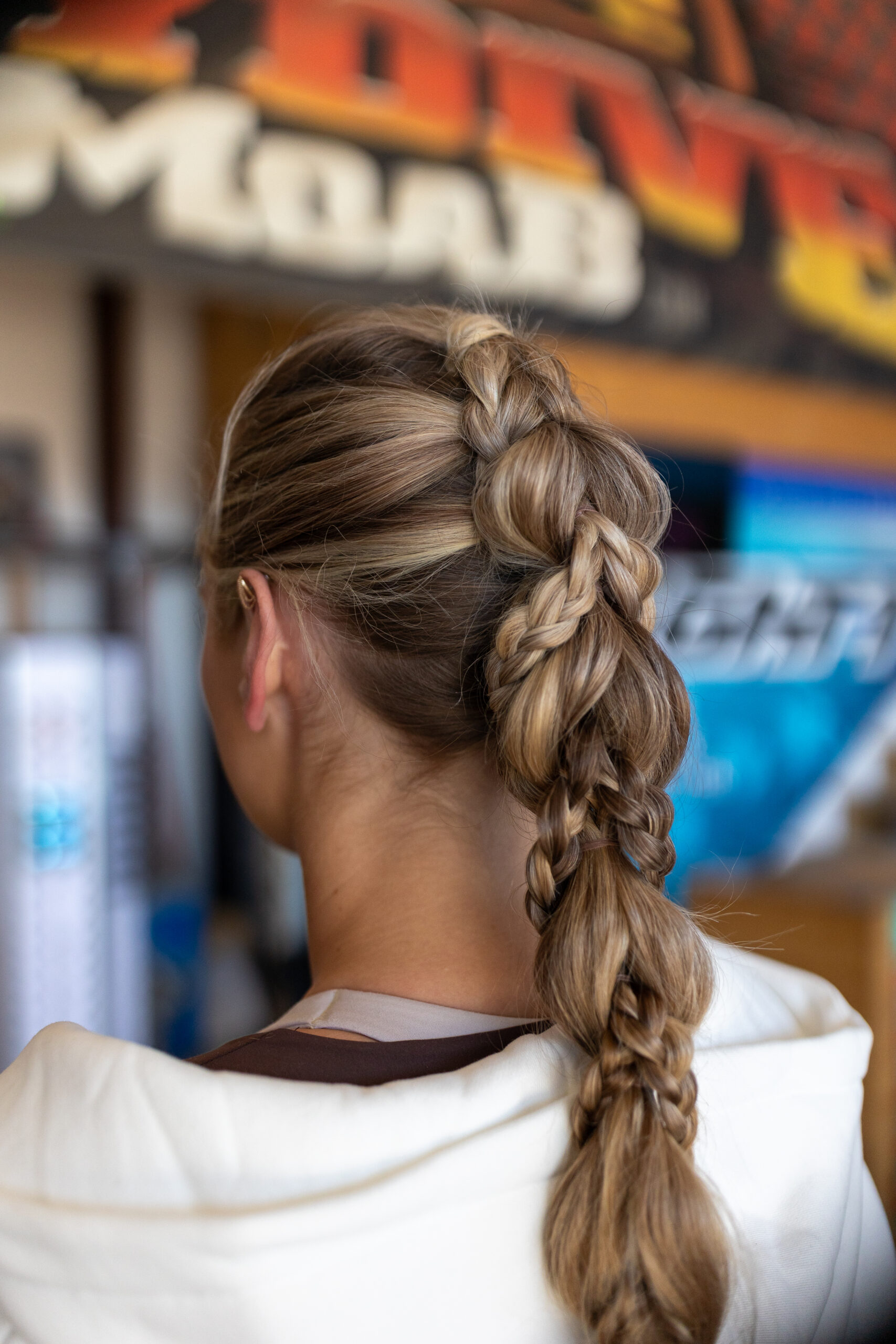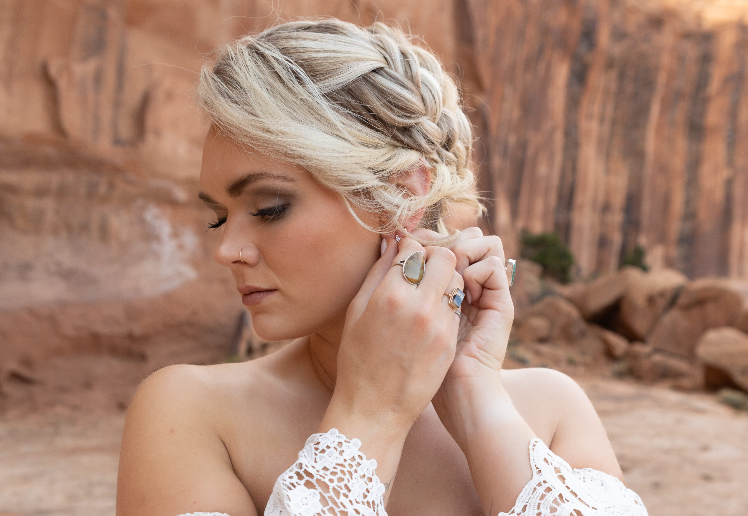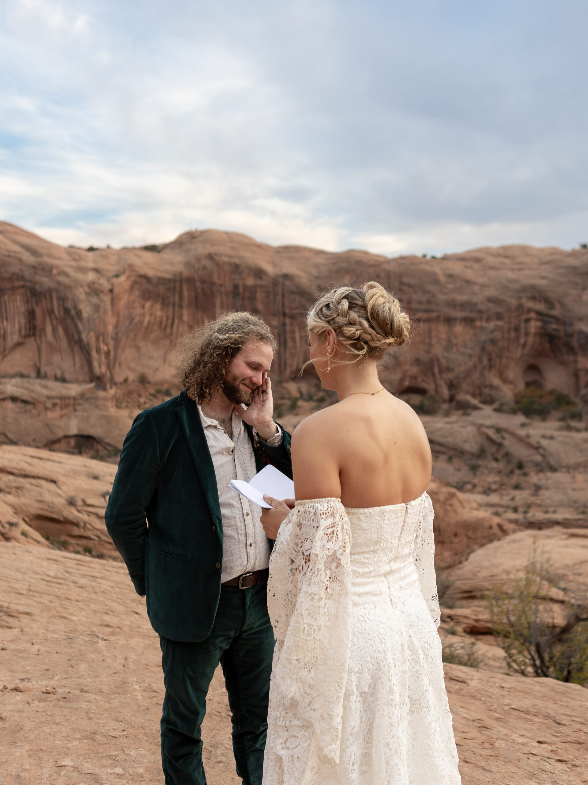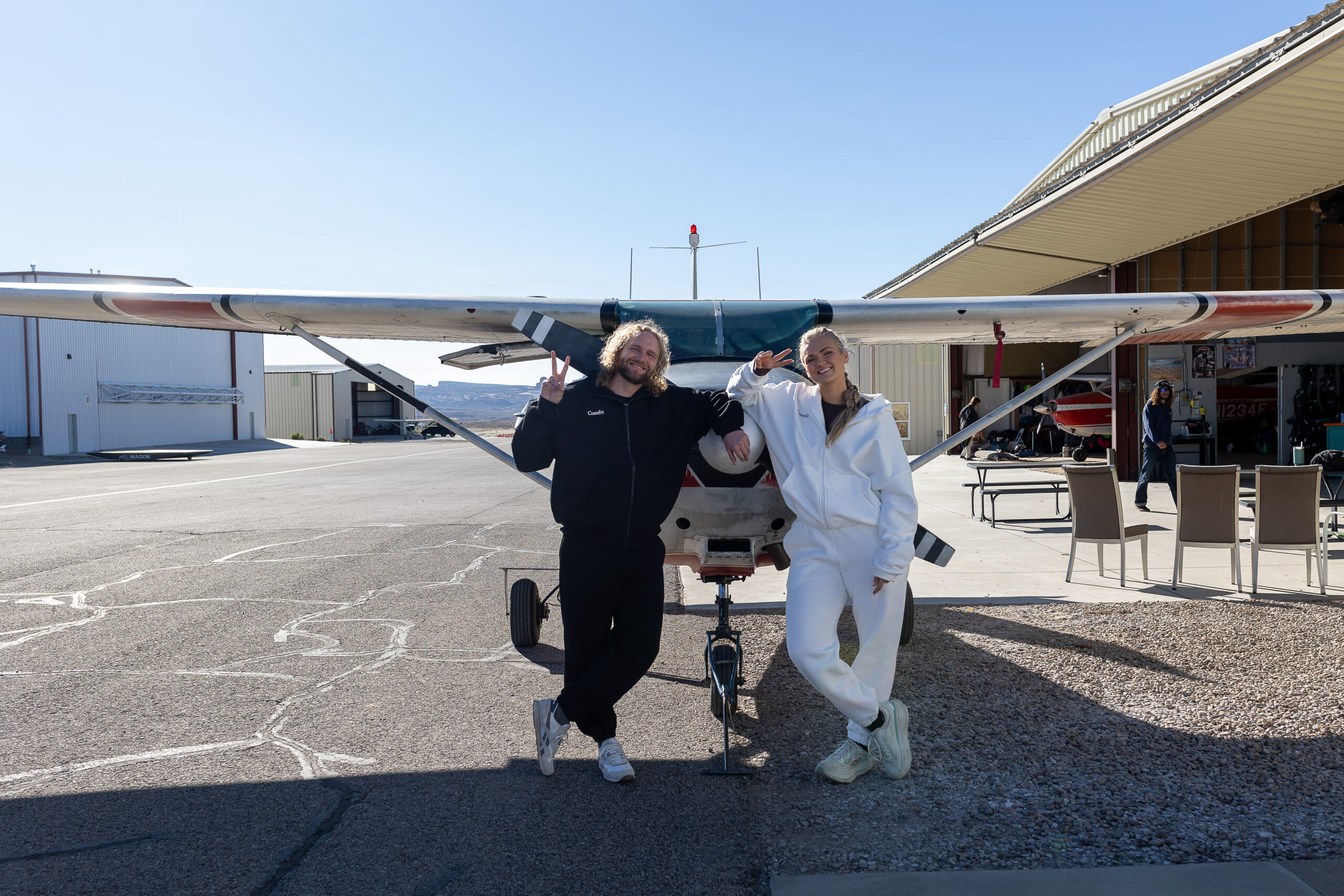 They woke up early in Moab and got ready in matching black-and-white sweatsuits. Isaac wore all black, while Madison wore an all-white set that felt effortlessly intentional. With the help of Wild Brides Backcountry, Madison’s hair and makeup were done that morning — including an intricate braid designed not only to be beautiful, but strong enough to withstand skydiving winds.