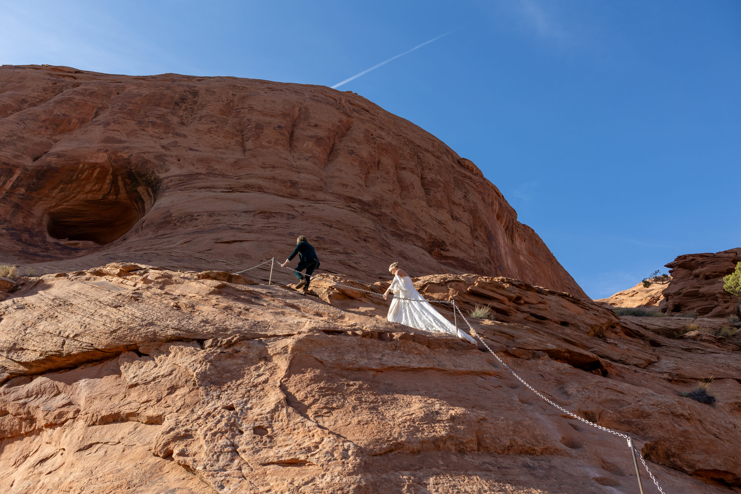 About halfway up, the trail becomes more challenging — a steep rock face with carved footholds and a rope to pull yourself up. Isaac stepped into hero mode, carrying both backpacks up first, then coming back down partway to help Madison up so she could focus fully on her footing in her wedding boots.
