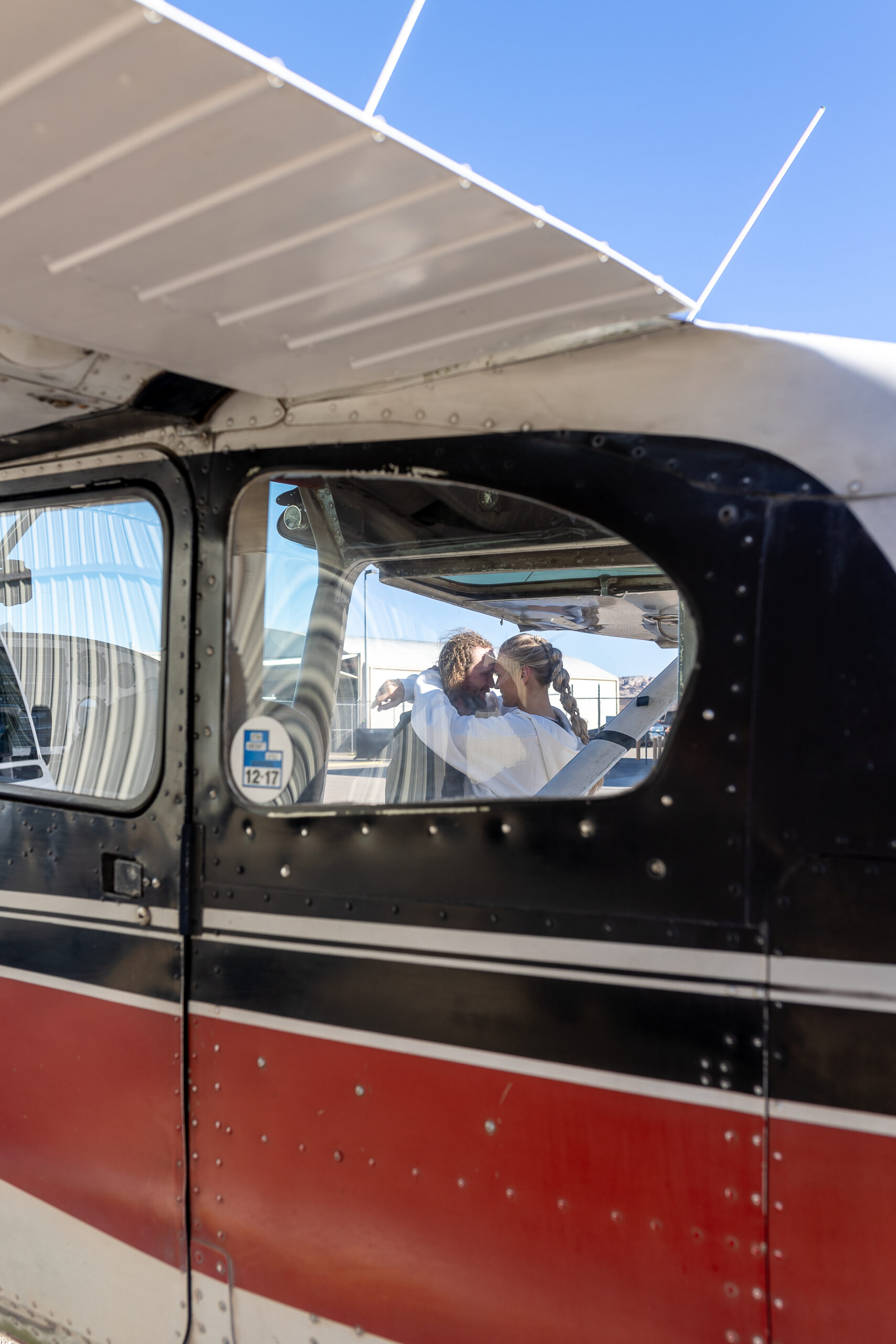 While we waited for their jump time, we took portraits around a small plane nearby. Madison and Isaac leaned into the moment; relaxed, excited, and fully present. The plane added such a fun, unexpected element to their photos, and it gave them time to settle into the experience together before taking the leap.